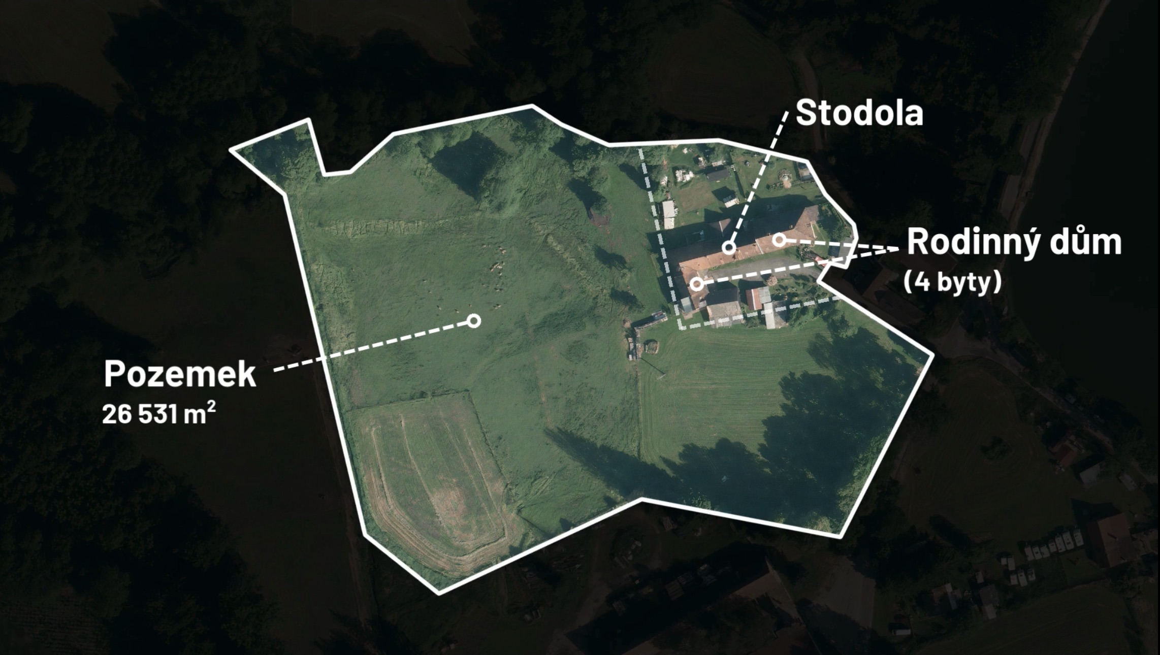 Jedná se o přízemní nemovitost, která nabízí 4 bytové jednotky o celkové velikosti 293 m2: tři bytové jednotky 2+1 a bytovou jednotku 3+1 včetně pokoje v podkroví. Součástí nemovitosti je také prostorná stodola, konírna, garáže a sklep.